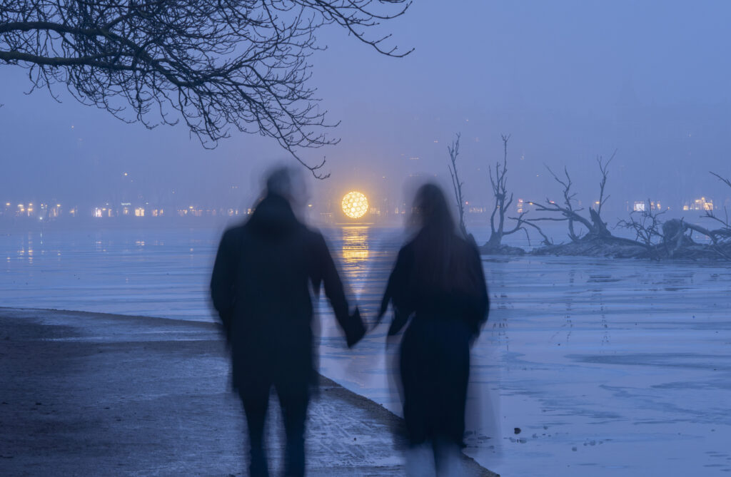Night view of Klosterenga Park in Oslo, featuring illuminated water cascades flowing through stone structures. The park's serene lighting highlights the natural elements, with the soft glow from beneath the waterfalls complementing the urban surroundings and creating a tranquil ambiance. Trees and pathways are dimly lit in the background, blending art, nature, and lighting design seamlessly.